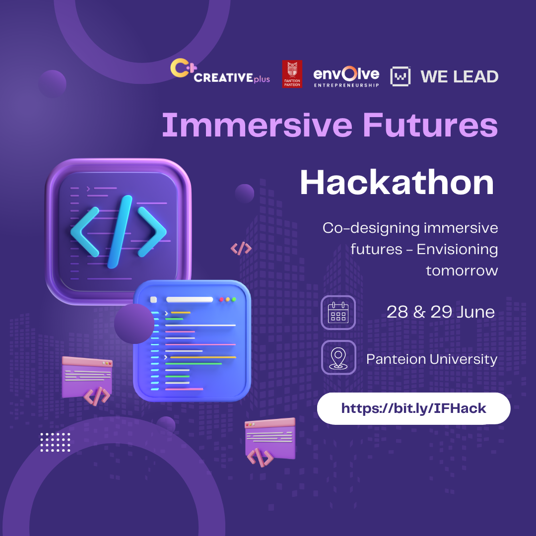 H CREATIVE+, η Δομή Επιχειρηματικότητας και Καινοτομίας του Παντείου Πανεπιστημίου και το Envolve Entrepreneurship, με την υποστήριξη του WE LEAD, διοργανώνουν hackathon ανοιχτής καινοτομίας και δημιουργικότητας με τίτλο “Immersive Futures Hackathon” που θα πραγματοποιηθεί την 28 – 29 Ιουνίου στο Αμφιθέατρο Σάκη Καράγιωργα 2 του Παντείου Πανεπιστημίου.